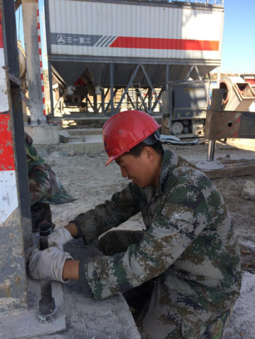 5月1日上午10點正在指揮瀝青拌合站主樓吊裝作業(yè)