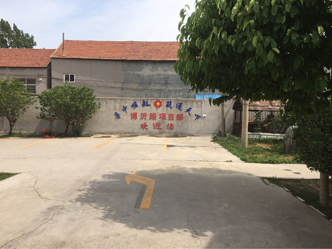 一進門,迎面看到的是一幅壯觀的公路高架橋為背景的魯中公路宣傳牌,左側(cè)是大幅魯中公路歷史業(yè)績與魯中公路養(yǎng)護公司以及博沂路的工程簡介,把破落的生產(chǎn)工廠阻擋在大家的視線之外。右側(cè)就是三個集裝箱改裝的職工宿舍整齊的擺放一排,再往后就是一排一層建筑物,房屋側(cè)面可以看到明顯的大字:企業(yè)核心力:擔當、團隊、執(zhí)行力。迎面墻上,設(shè)有“魯中崛起、筑通天下”的博沂路項目部歡迎您的字樣。