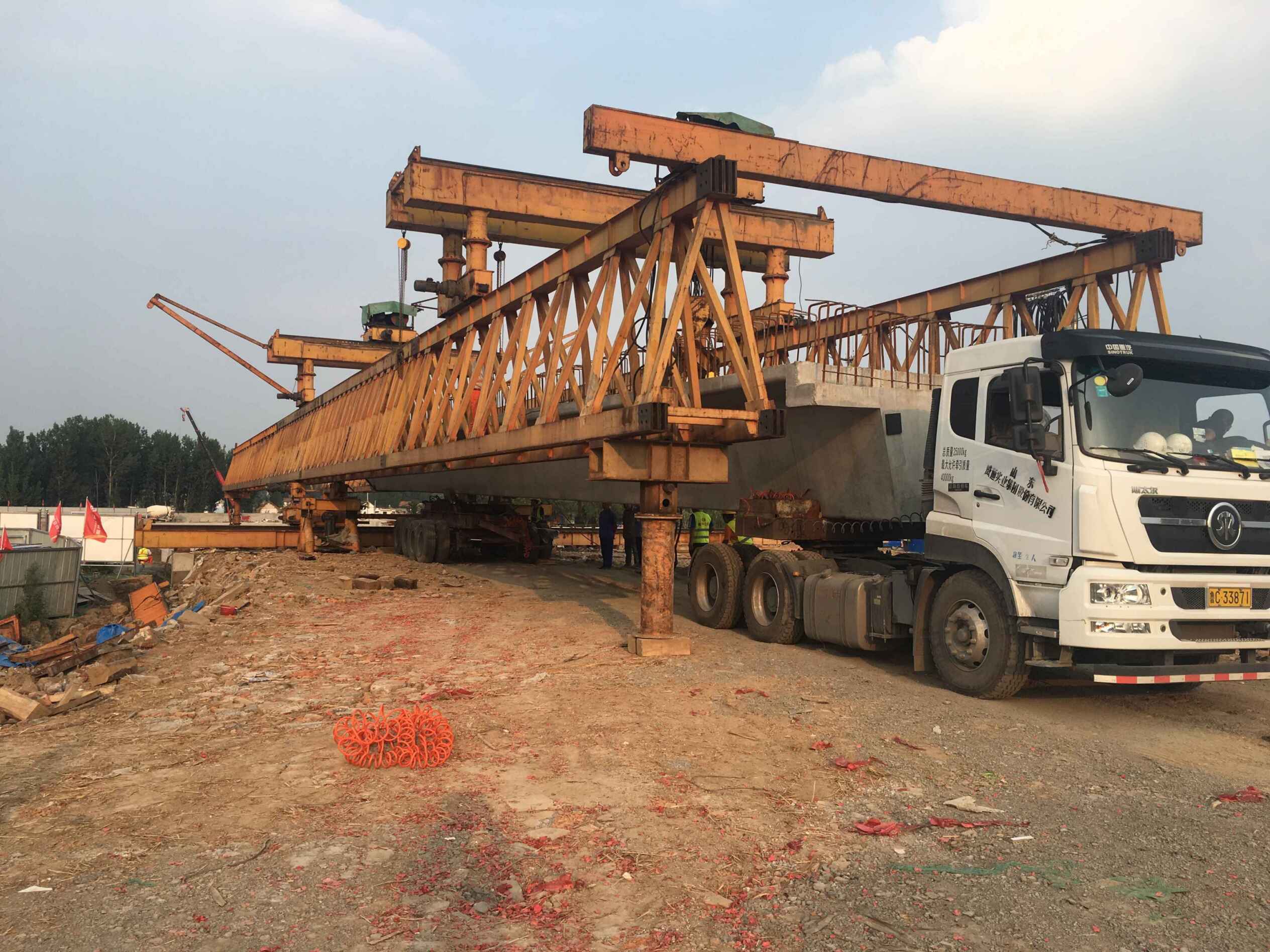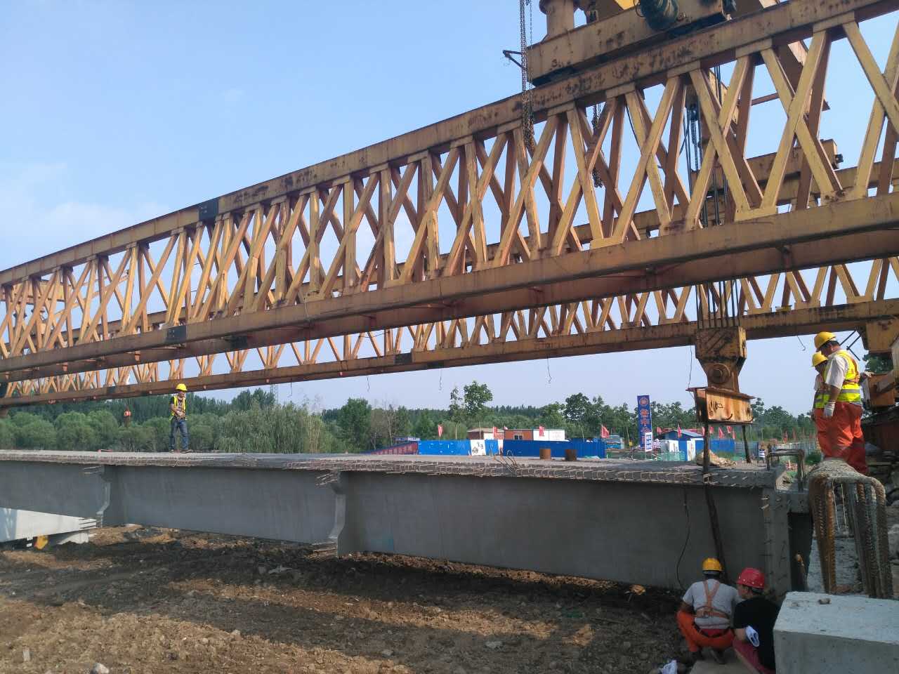 為確保架梁施工安全,項(xiàng)目部精心制定施工方案。同時,在架梁機(jī)械驗(yàn)收合格后多次對其進(jìn)行檢查,對作業(yè)人員進(jìn)行班前教育,做好交底,制定應(yīng)急預(yù)案,保證了整個架梁過程安全、高效。隨著架梁設(shè)備有節(jié)奏的完成一項(xiàng)項(xiàng)動作,襯墊、落勾、試吊、起吊、推進(jìn),在一串協(xié)調(diào)而又連貫的運(yùn)作之后,人民路延伸工程孝婦河橋第一片梁板穩(wěn)穩(wěn)降落在它發(fā)揮作用的位置上。