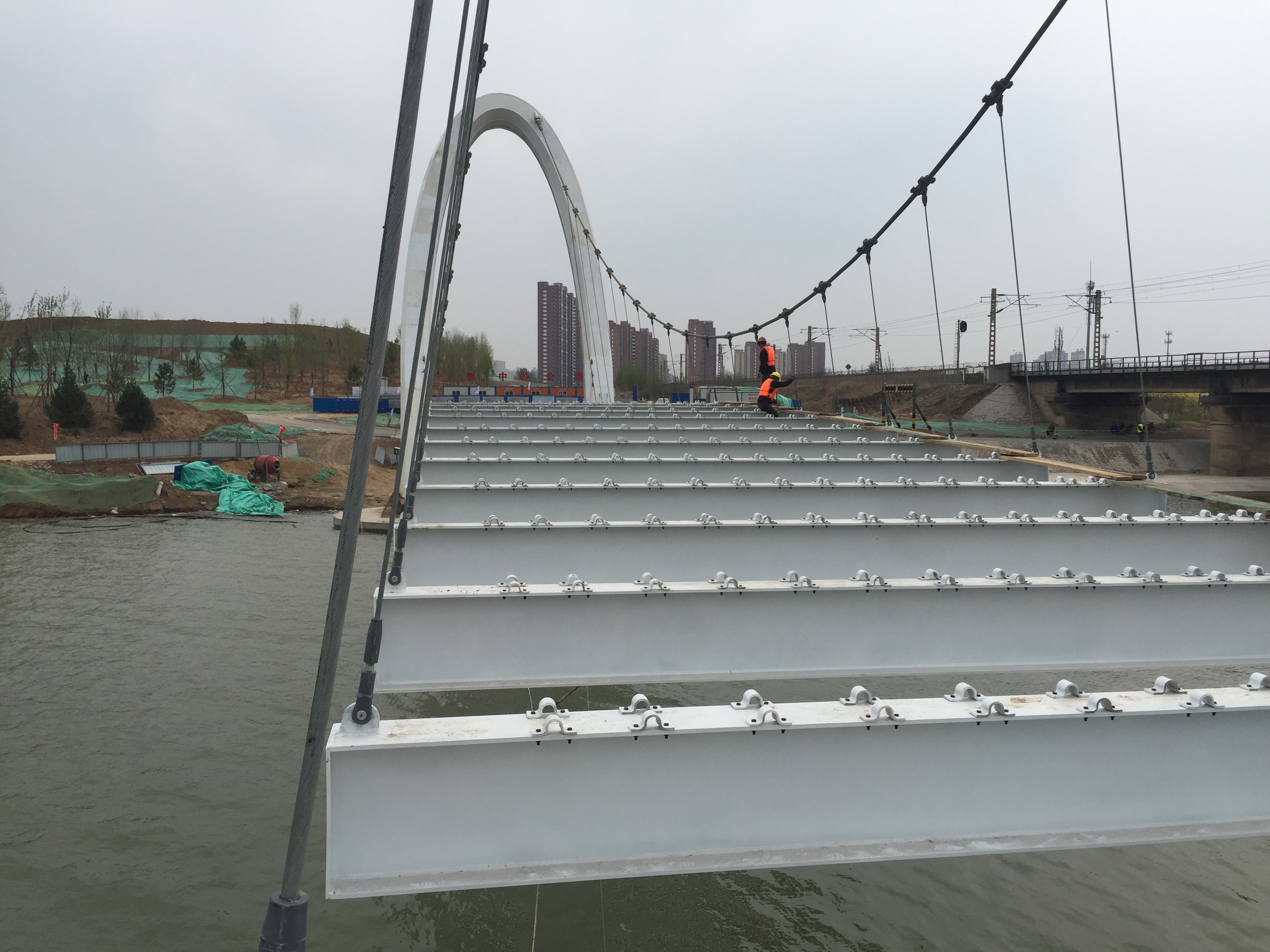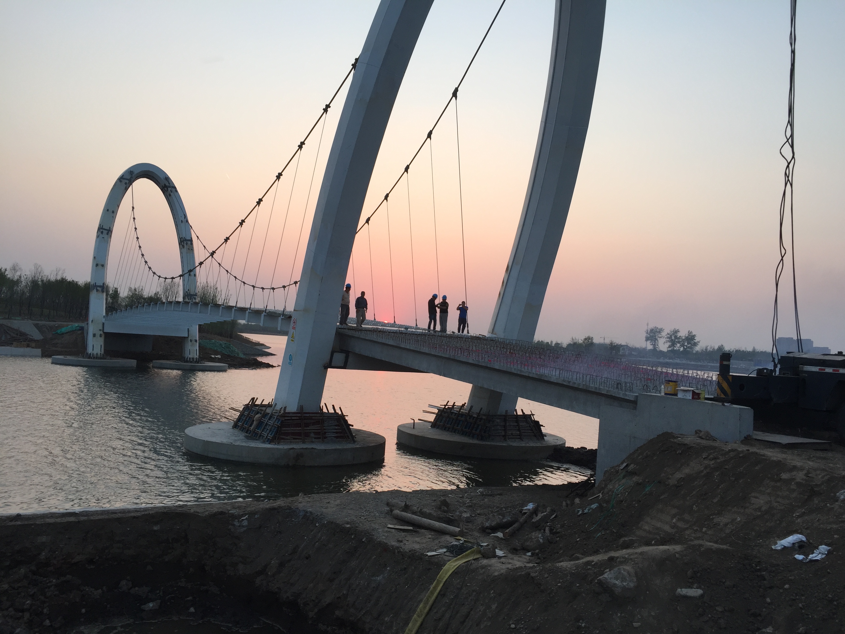 美麗的孝婦河濕地公園內(nèi)矗立著一座雄偉的白色懸索橋,它緊鄰膠濟(jì)鐵路客貨雙線橋,橫跨孝婦河?xùn)|西兩岸,遠(yuǎn)遠(yuǎn)望去猶如一條鋼鐵巨龍?jiān)陉柟庀蚂陟谏x。陽光下,碧波蕩漾,懸索橋意氣風(fēng)發(fā)盤踞在水波之中;夜空中,星輝閃耀,懸索橋潔白如玉與銀河相互輝映。這就是由我山東魯中公路建設(shè)有限公司所承建的淄博市第一座鋼結(jié)構(gòu)懸索橋。