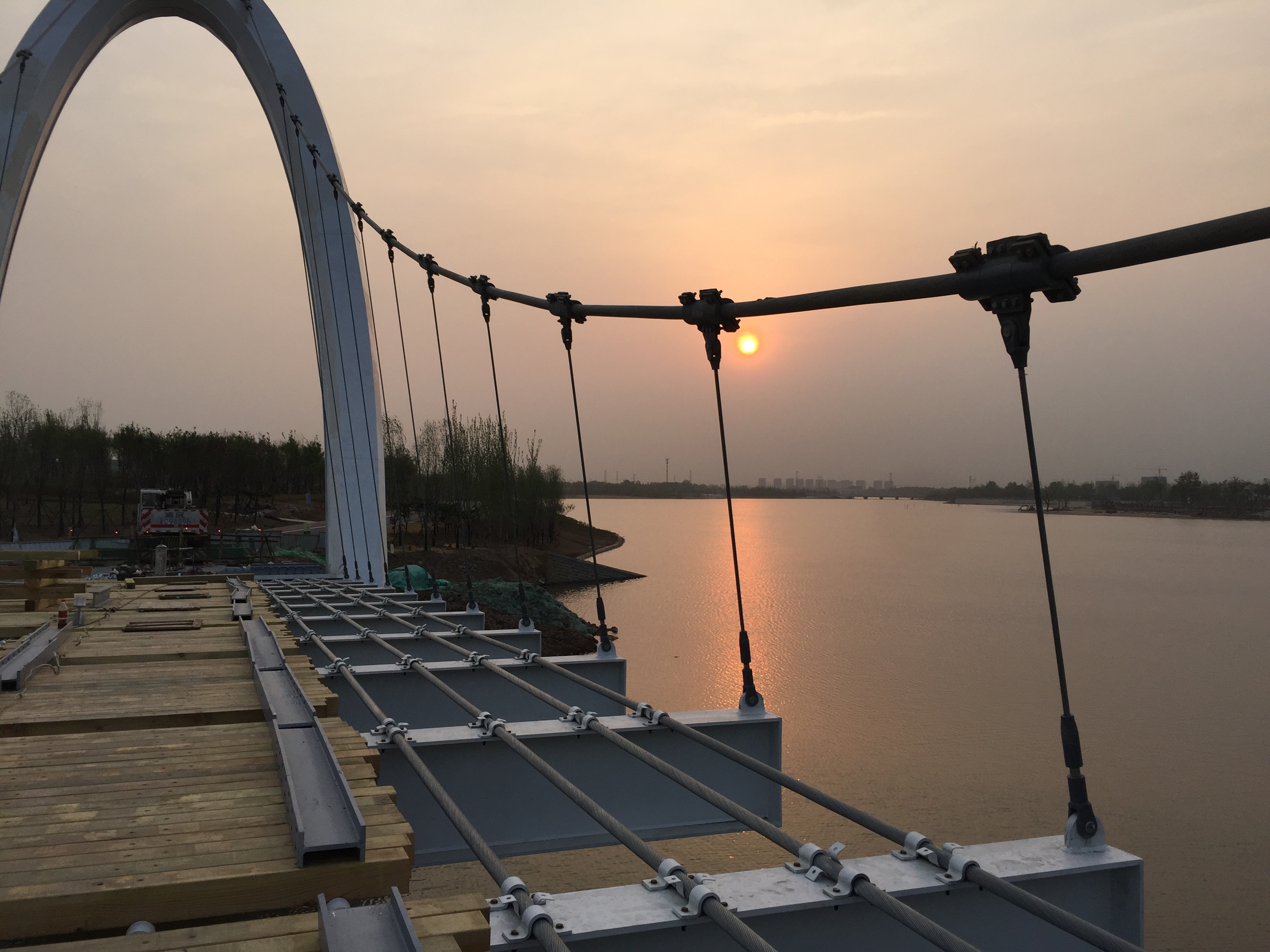 作為園區(qū)內(nèi)的景觀橋,懸索橋氣勢磅礴又婀娜飄逸,雙塔靈犀相望,橋索相連成趣,使得懸索橋極具靈動(dòng)的現(xiàn)代氣息。懸索橋是園區(qū)僅有的跨河通道,駐依纜索,迎著河面的風(fēng),腳下是碧波蕩漾的河水,極目周邊是惹人的花紅綠植,間或看到樹叢間閃現(xiàn)遠(yuǎn)處的高樓,還有偶爾的動(dòng)車從毗鄰的鐵路橋瞬間駛過,現(xiàn)代的繁華中難得的幾分清淡恬然不由讓人心醉。懸索橋以它獨(dú)具匠心的設(shè)計(jì)理念、專業(yè)精湛的施工工藝、妥帖合適的材料元素,成為了園區(qū)一道靚麗的風(fēng)景線。