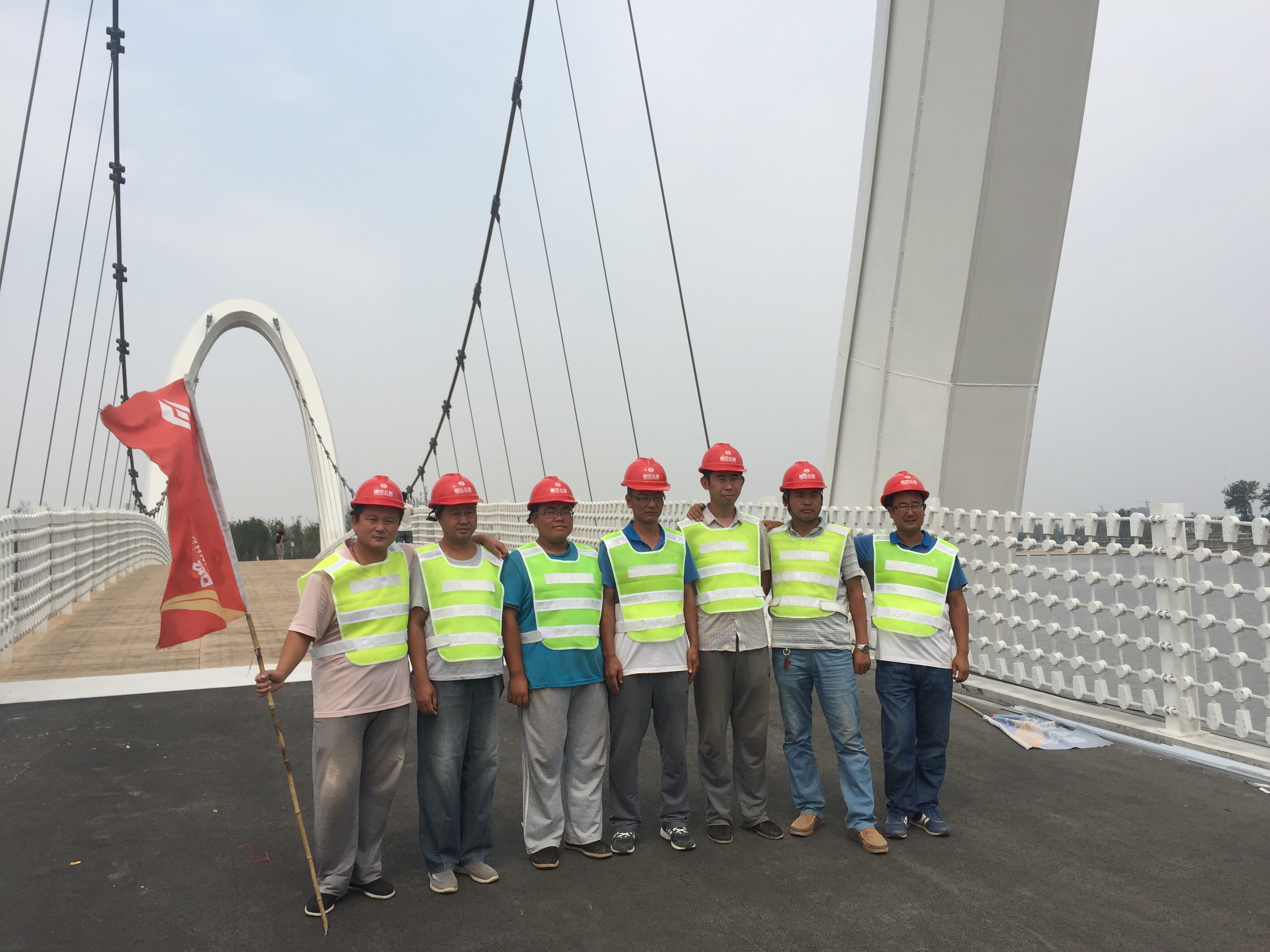 剛具雛形的大橋已經(jīng)美得惹人心醉,陽光下她白玉無瑕,夕陽中她粉魘如花,一根根鋼索,遠(yuǎn)望去,猶如珠簾般令她更加搖曳生輝。隨著工序的進(jìn)展,我們開始了橋面防腐木的鋪裝工作。1920條防腐木,護(hù)欄索30000多套不銹鋼螺絲,近6000個(gè)專門定制的異型PE件,全靠手工安裝、調(diào)整,懷揣著對懸索橋的那份執(zhí)著,大橋的建設(shè)者們采用人海戰(zhàn)術(shù)搶趕工期。近8個(gè)月的朝夕相伴,隨著護(hù)欄索的最后一道工序防銹噴漆作業(yè)的結(jié)束,懸索橋終于如期竣工了,人與橋互相見證了彼此的努力與成長,曾經(jīng)那一道道耀眼的電弧焊光,那一聲聲鋼撞鐵碰的聲響,那一車車混凝土的澆筑,成為了我們烙在心間的永恒記憶。