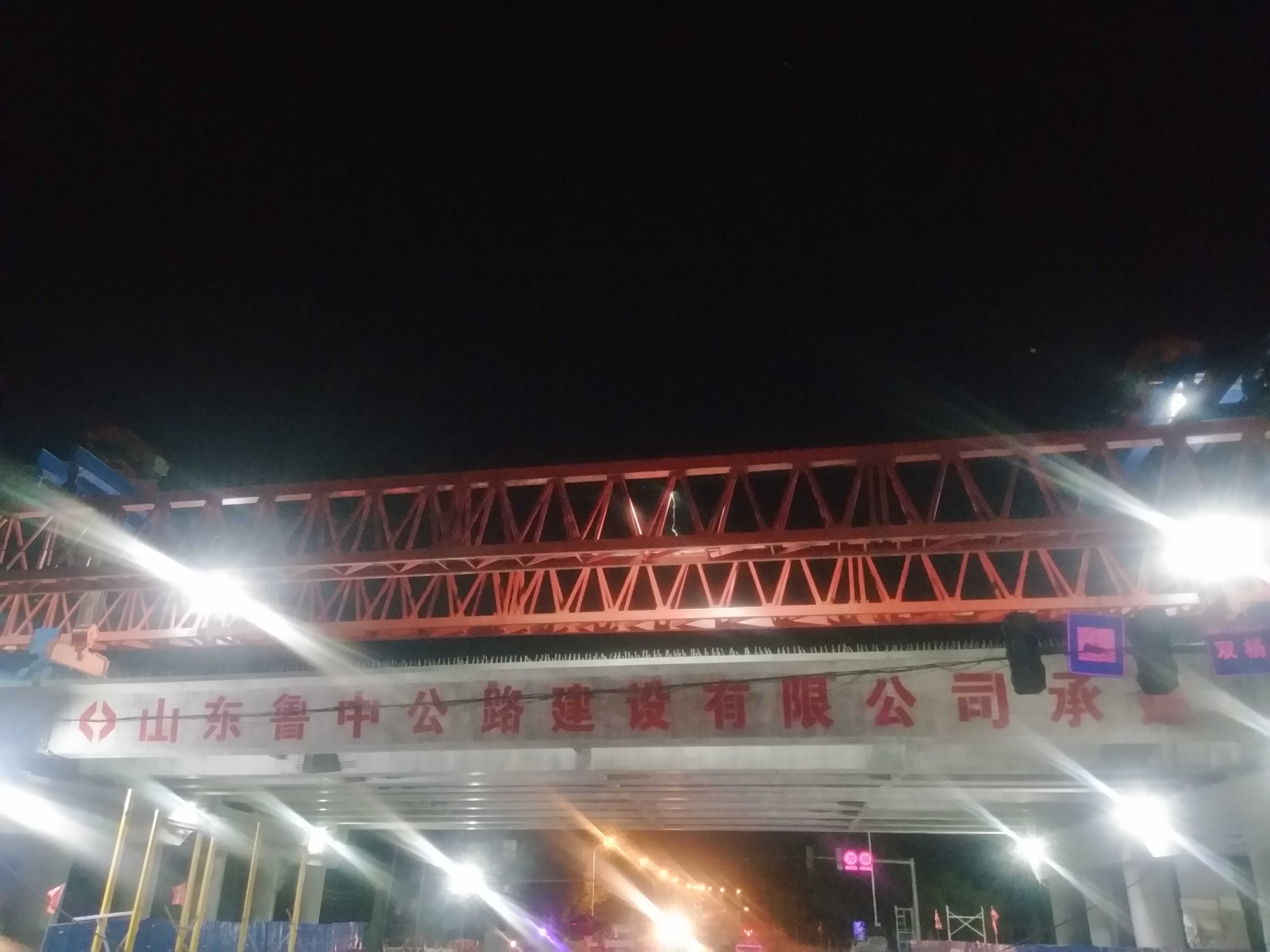 前期積極準(zhǔn)備,制定下設(shè)施工防護(hù)大棚,車輛兩側(cè)便道分流,凌晨集中施工的方案。凌晨的夜寂靜祥和,然而張博路卻干的熱火朝天,為了不延誤工期,我們必須打起十二分的精神,順利確保十片箱梁準(zhǔn)確無誤跨過張博路。