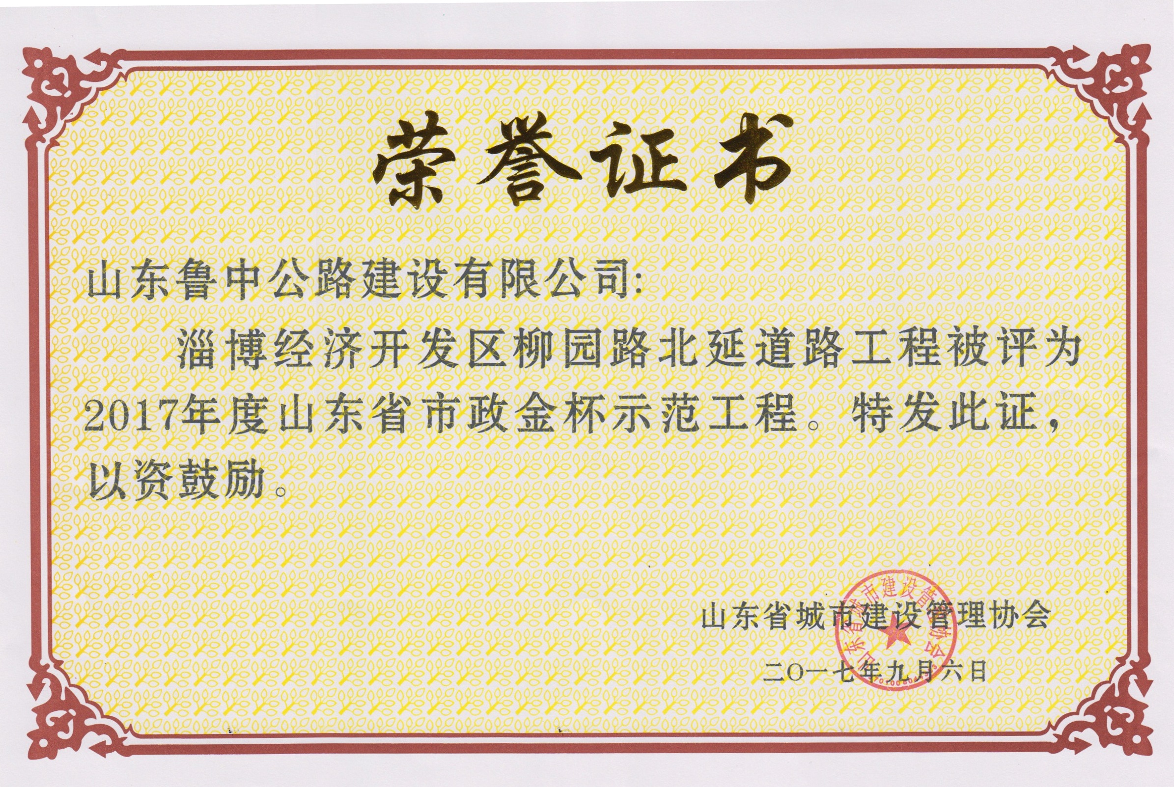 2017年9月6日,山東魯中公路建設(shè)有限公司傳來喜訊,淄博經(jīng)濟(jì)開發(fā)區(qū)柳園路北延道路工程被評為2017年度山東省市政金杯示范工程。