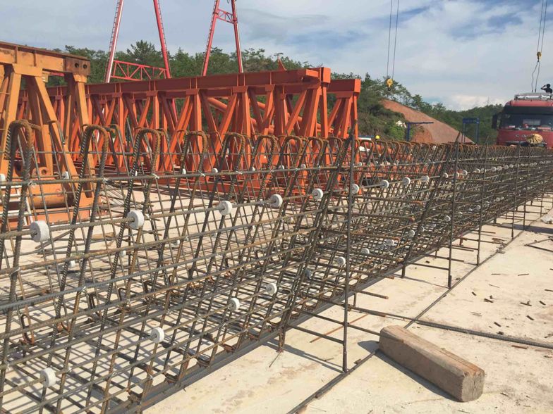 二、使用方法將胎架放置在水平的硬化場地,首先將裁好的腹板外層縱向筋擺放到胎架套筒水平定位筋上,再將加工好的腹板環(huán)形筋和底板環(huán)形筋按刻度一一擺放好并與縱向筋綁扎,然后再穿入底板縱向筋并按刻度綁扎,最后綁扎腹板內(nèi)側(cè)縱向筋。上述工作全部進行完畢,經(jīng)監(jiān)管工程師驗收后,將胎架兩側(cè)水平定位筋由套筒向外抽出,采用龍門吊即可將骨架吊裝至箱梁底模,接著進行下一道工序。