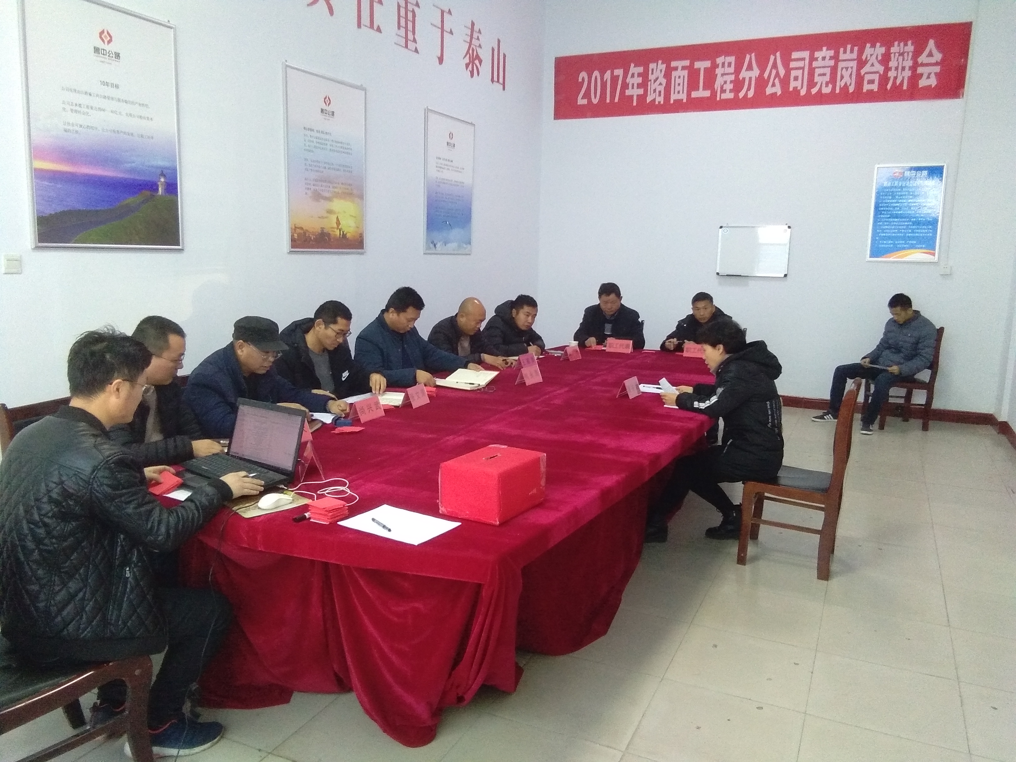 為貫徹落實(shí)《公司管理體制機(jī)制改革方案》,加強(qiáng)分公司各個項(xiàng)目的各部門職能崗位責(zé)任,完善分公司管理體系,在分公司領(lǐng)導(dǎo)的高度重視、安排、部署下,山東魯中公路建設(shè)有限公司路面工程分公司經(jīng)過前期系列精心準(zhǔn)備工作,成立了以分公司領(lǐng)導(dǎo)班子為主要成員的競聘工作小組。并于2017年12月21日上午九點(diǎn)整,正式召開路面工程分公司競崗答辯會。