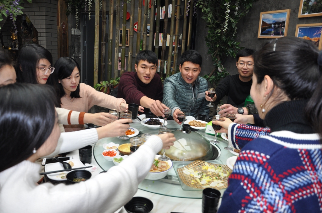 一上午的活動充實又趣味十足。意猶未盡之中,大家離開植物園區(qū),前往獨具特色的“脆肉鯇”餐廳享用午餐。走出室外,雪花已是變大了不少,這讓大家興奮不已,一路追逐著,笑鬧著。沿途經(jīng)過布滿花燈的鵲橋,大家紛紛合影留念。進(jìn)入餐廳,美味的食物,蔓延的友誼,年青人們觥籌交錯,開懷暢談。幽默的自我介紹,興趣愛好的相互交流,團(tuán)坐在暖暖的蒸鍋周圍,一頓飯吃的是熱火朝天。