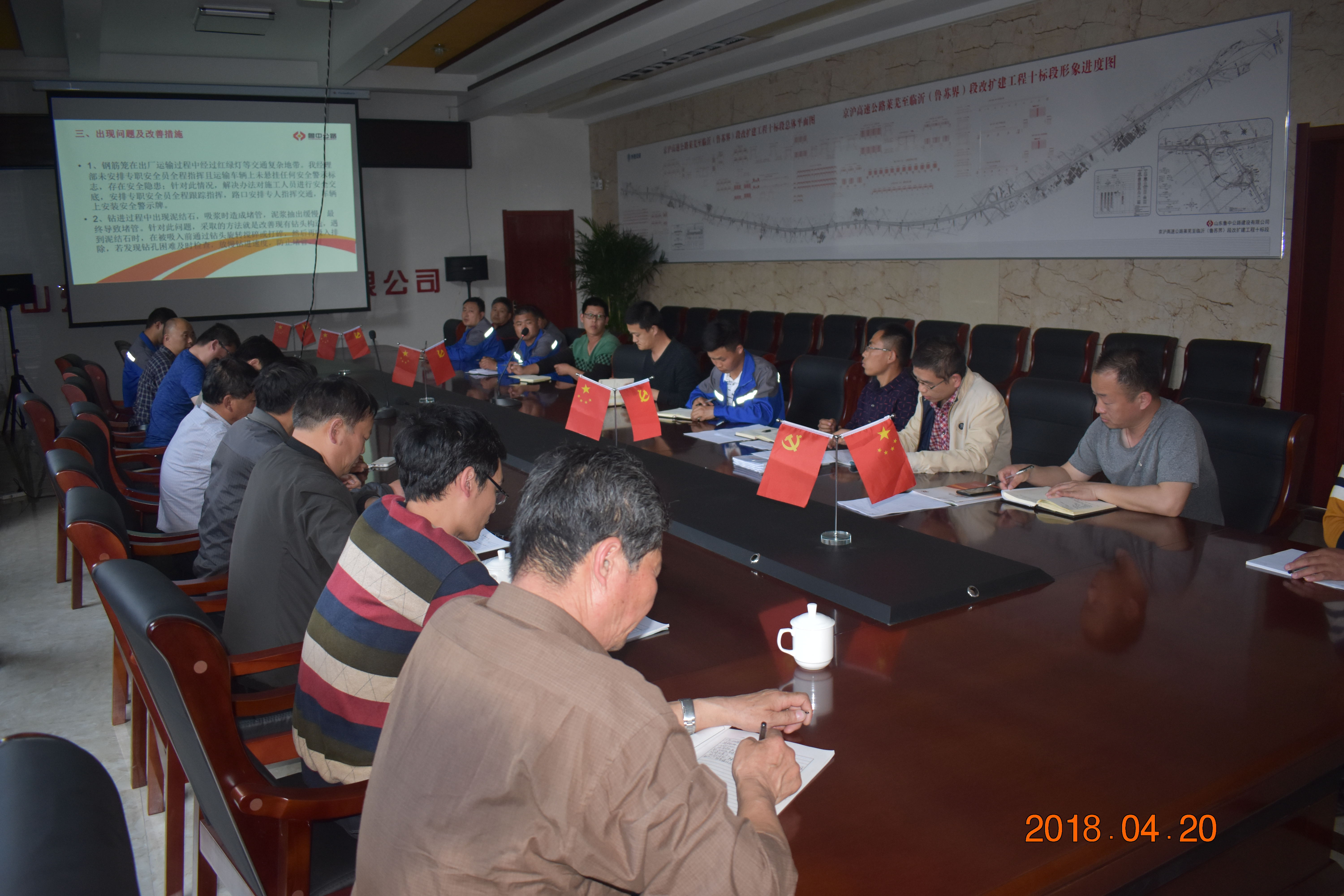 人間四月芳菲盡,山寺桃花始盛開,晴天滿日雨水短,正是工程大干時(shí)。2018年4月20日下午兩點(diǎn),G2京滬項(xiàng)目部在項(xiàng)目部一樓會(huì)議室召開漿噴樁技術(shù)交底會(huì)議。駐地辦監(jiān)理、項(xiàng)目經(jīng)理、副經(jīng)理、總工、相關(guān)科室人員、施工隊(duì)主要負(fù)責(zé)人等相關(guān)人員參加此次會(huì)議。