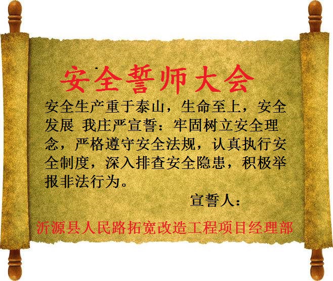 沂源縣人民路拓寬改造項目也不甘落后,于6月1日養(yǎng)護分公司召開安全月動員大會后,治安科就開始行動起來,印條幅、綬帶、帶領(lǐng)大家觀看警示視頻等,并于6月7日組織全體職工及施工隊負責(zé)人進行了一次“安全誓師大會”。