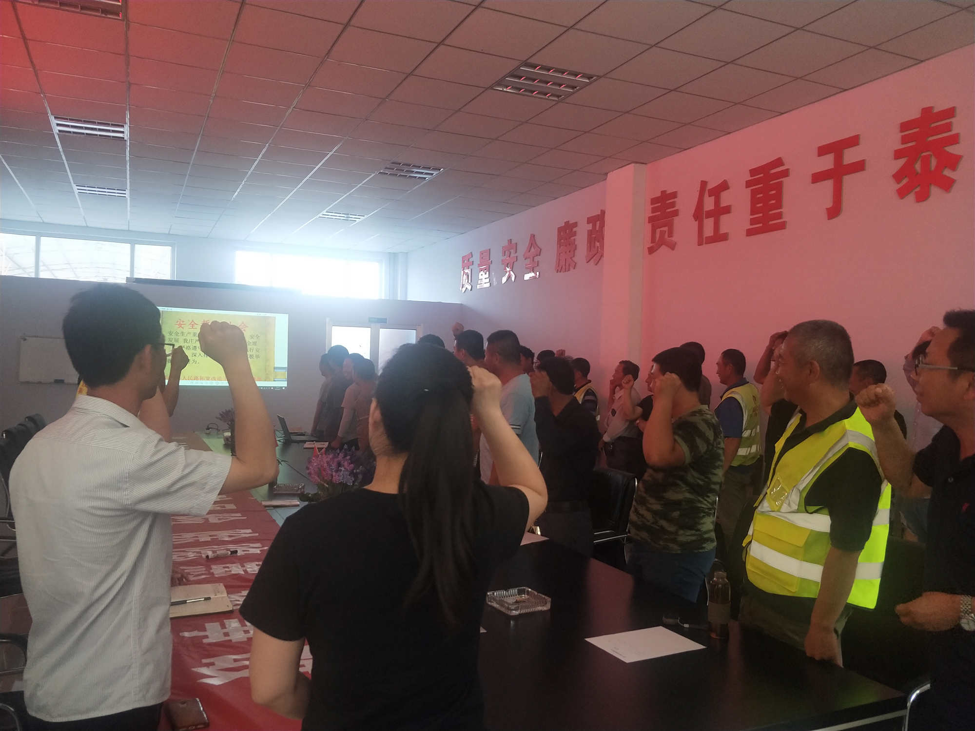 18點沂源縣人民路下屬施工隊現(xiàn)場負責(zé)人20幾人陸續(xù)來到會議室,一起用洪亮的聲音,對安全制度的遵守等進行了宣誓并簽名。