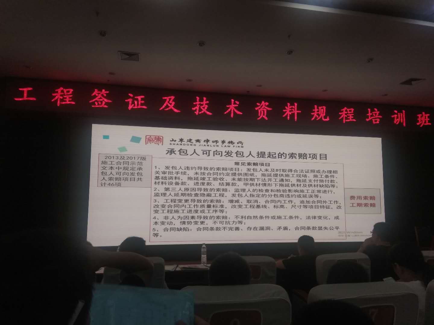 6月27日在淄博職業(yè)學(xué)院參加了淄博市建筑業(yè)協(xié)會(huì)組織的工程簽證及技術(shù)資料規(guī)程培訓(xùn)。此次培訓(xùn)由淄博市人民法院審判監(jiān)督庭王庭長(zhǎng)及山東建侖律師事務(wù)所的律師對(duì)工程中簽證的意義、怎樣規(guī)范簽證、簽證的分類(lèi)、工程索賠及因簽證引起的糾紛案件等方面進(jìn)行了深層次的講解。