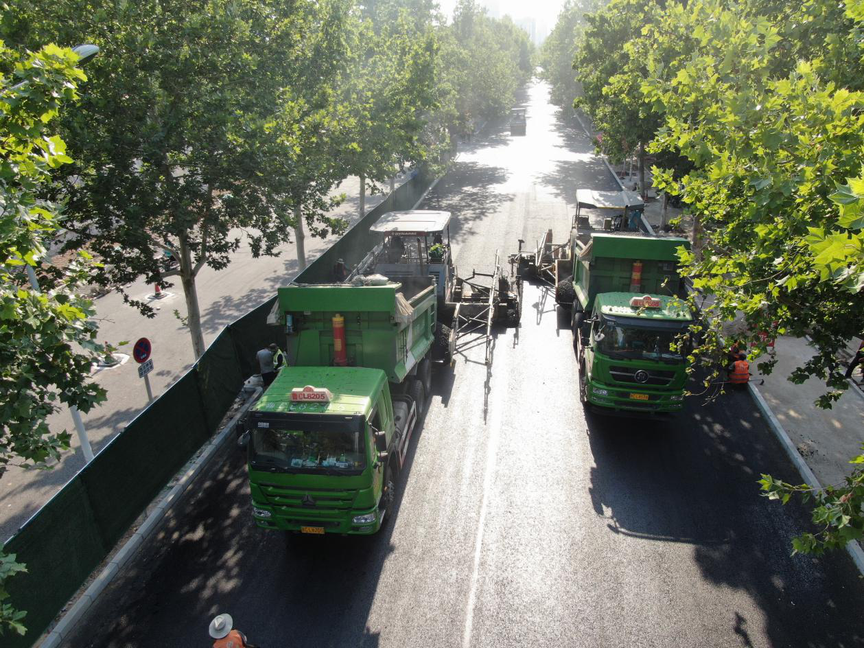 2019年6月23日,共青團(tuán)路開(kāi)工的第三個(gè)月,主路瀝青上面層順利完成攤鋪。日升月落三個(gè)月,不僅共青團(tuán)路的梧桐枝繁葉茂,共青團(tuán)路也已經(jīng)改頭換面。