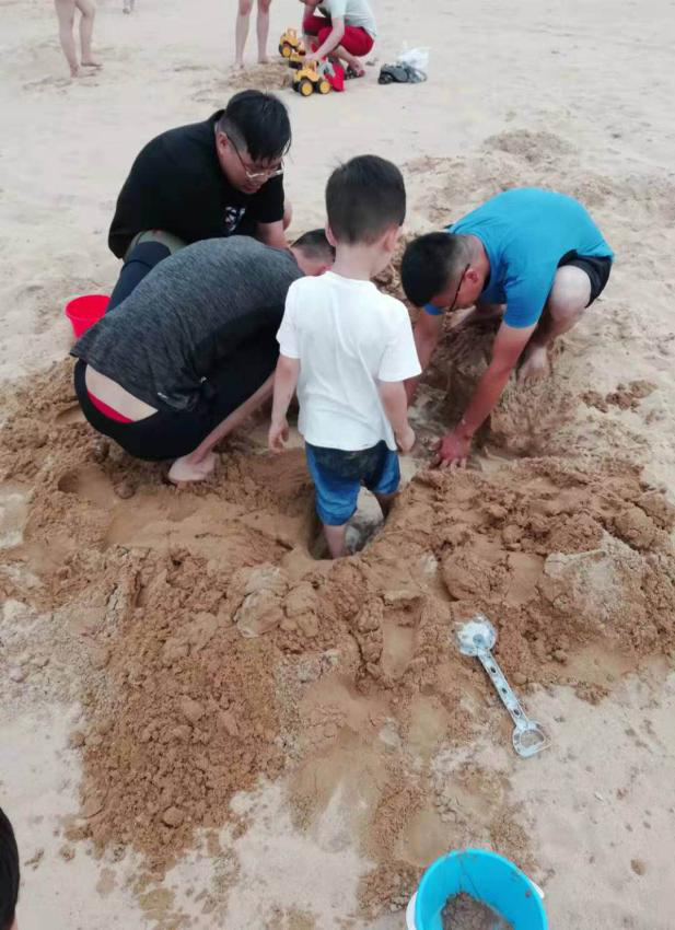 參觀完工地后組織員工與孩子們?nèi)ノ牟碁┥先ネ嫠?,孩子們看到沙灘和湖水便興沖沖的拉著爸爸媽媽去玩耍,有的在湖里面和新結(jié)交的好朋友打水仗,有的小朋友在沙灘上堆沙堡,有的小朋友索性沙灘上一躺,很是愜意。玩耍完畢后是團圓水餃的活動,由家庭與孩子們一起包水餃,孩子們活潑俏皮的參與其中,弄得臉上變成了小花貓。