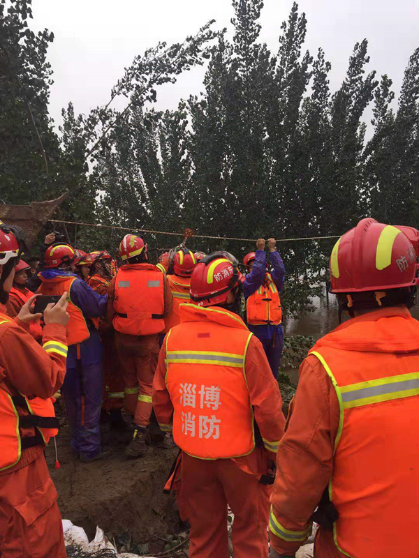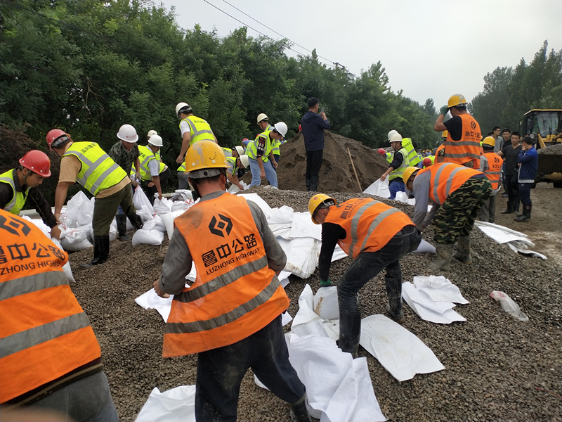 受“利奇馬”影響,8月10號到12號淄博市普降暴雨,孝婦河水位暴漲,袁家橋村段發(fā)生兩處50米、10米的決口,附近村莊被淹,情況危急。在項目自身受到臺風與洪水影響的情況下,魯中公路經(jīng)開區(qū)分公司自8月11日17時開始,分批次投入搶險人員34人,搶險車輛7臺,冒雨投入到抗洪救災搶險工作中。8月12日4時,魯中公路柳園路孝婦河橋項目部又組織11人救援小組與一臺裝載機雨中再次奔赴搶險救援現(xiàn)場。在省、市、開發(fā)區(qū)、及市交通運輸局等領導的督導下,水利專家的指導下,魯中公路與500多名武警官兵、公安干警、消防戰(zhàn)士,及經(jīng)開區(qū)管委會、經(jīng)開區(qū)各施工單位,當?shù)孛癖姷?000多人經(jīng)過兩天近50個小時的日夜奮戰(zhàn),8月13日下午16時,袁家橋段缺口成功堵住。