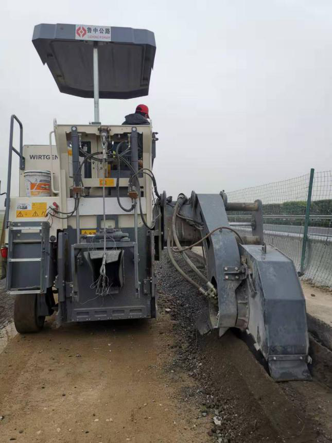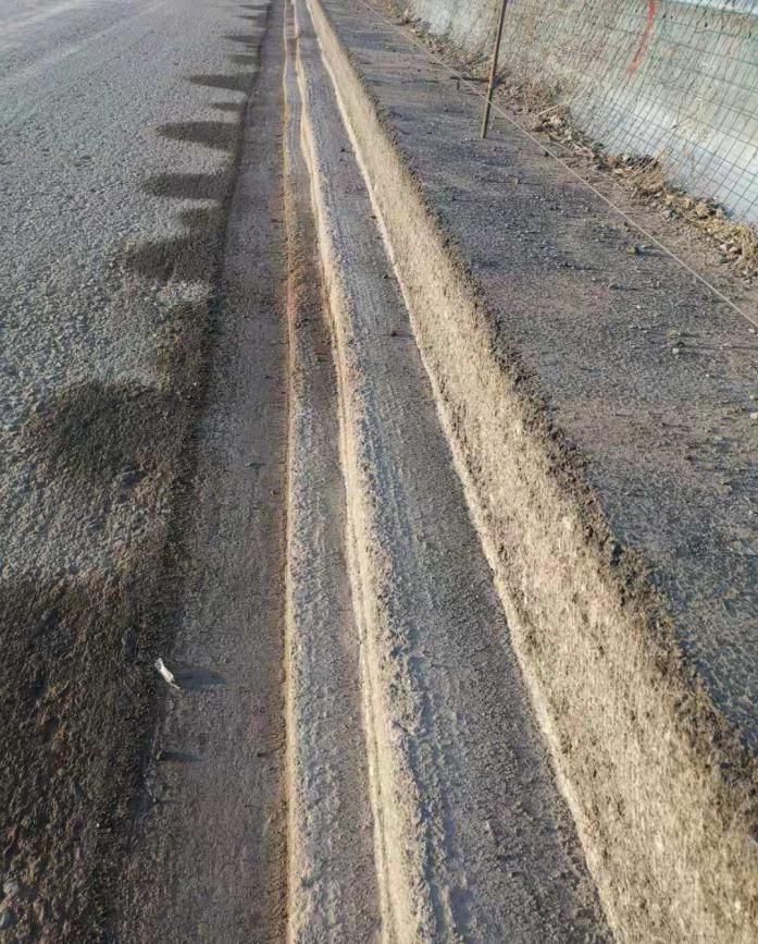 由于改裝的銑刨機是在右后方增加一個銑刨鼓,所以銑刨機的重心轉(zhuǎn)移到右后輪,在調(diào)轉(zhuǎn)的過程中,左幅大部分上坡道不是無法承重,就是寬度不足,導(dǎo)致每次調(diào)轉(zhuǎn)都是一個大問題。后來想著從橋面上通過,于是利用銑刨老路臺階的銑刨料墊路,有壓路機壓實,當(dāng)?shù)谝淮螐臉蛎嫔贤ㄟ^時,心情無比的激動,因此銑刨工作大大提高了效率。現(xiàn)在導(dǎo)改之后,右幅是在老路路面上銑刨,沒有了左幅的那些困難,銑刨出來的順直度也比左幅好一些,這就是銑刨臺階的故事。