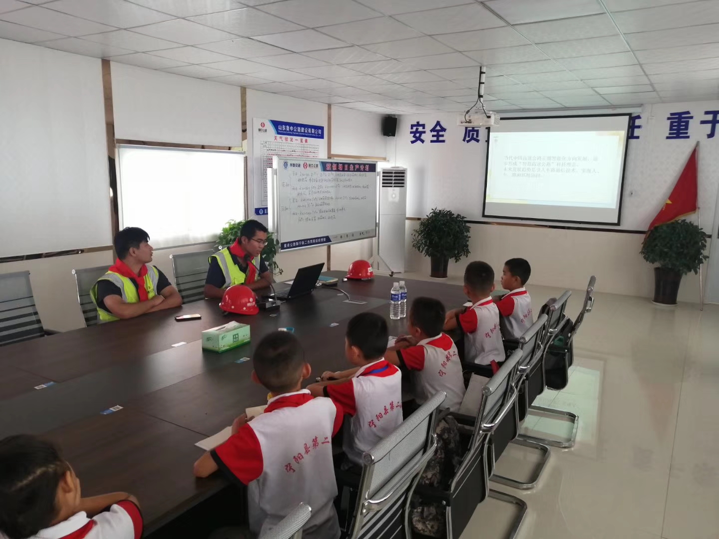 孩子們的到來受到了梁場工作人員的熱烈歡迎,二分部總工管文斌向少先隊員們詳細介紹了山東魯中公路建設有限公司和董梁公路新寧段項目建設概況。少先隊員們?yōu)檫@些奮戰(zhàn)在一線的大哥哥們系上他們心愛的紅領巾。