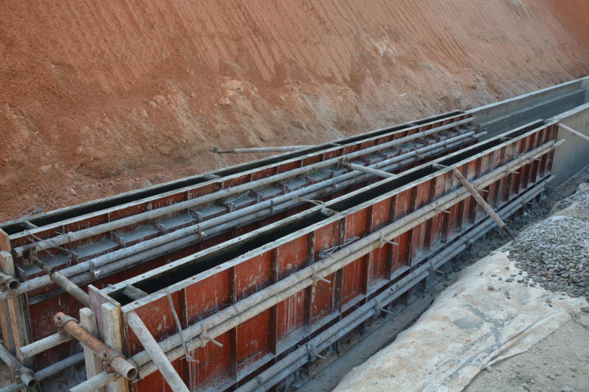 路面邊溝施工全部采用新型整體式定型鋼模施工,大大提高了路面邊溝的整體外觀及成品質(zhì)量。首先整理溝槽底部,將溝槽底部整理平整后,將土工布平整的鋪在上面,再鋪設(shè)透水管,透水管鋪設(shè)完成后,進(jìn)行碎石回填,碎石填筑到設(shè)計(jì)標(biāo)高后進(jìn)行混凝土底板模板支設(shè),模板支設(shè)完成后,在碎石面層鋪設(shè)防滲薄膜,然后進(jìn)行混凝土澆筑,待混凝土終凝后拆模,最后進(jìn)行邊溝墻身整體式鋼模支設(shè),支設(shè)完成后進(jìn)行混凝土澆筑,混凝土終凝后進(jìn)行拆模覆蓋灑水養(yǎng)生7天。