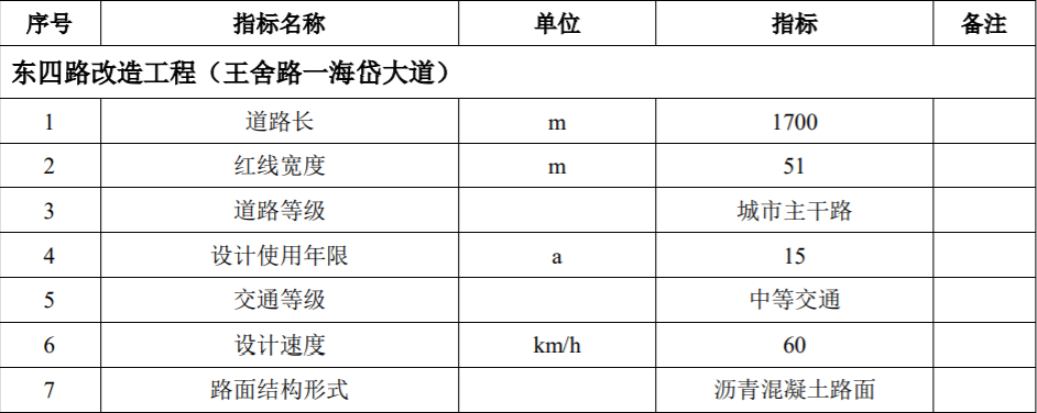 東四路改造工程(王舍路一海岱大道)在現(xiàn)有東四路基礎(chǔ)上進(jìn)行提升改造,總占地面積約118畝,其中原有土地面積18畝,新征地面積100畝。北起王舍路,南至海岱大道,采用一塊板道路橫斷面、慢行交通一體化交通模式,斷面形式為:4.5(綠化帶)+6米(慢行一體)+3米(分隔帶)+24米(機動車道)+3米(分隔帶)+6米(慢行一體)+4.5(綠化帶)。該路段長度約1700米,規(guī)劃紅線寬度51米,雙向6車道,建設(shè)內(nèi)容包括路基、路面、給水、排水、照明、綠化及交通工程等附屬設(shè)施。