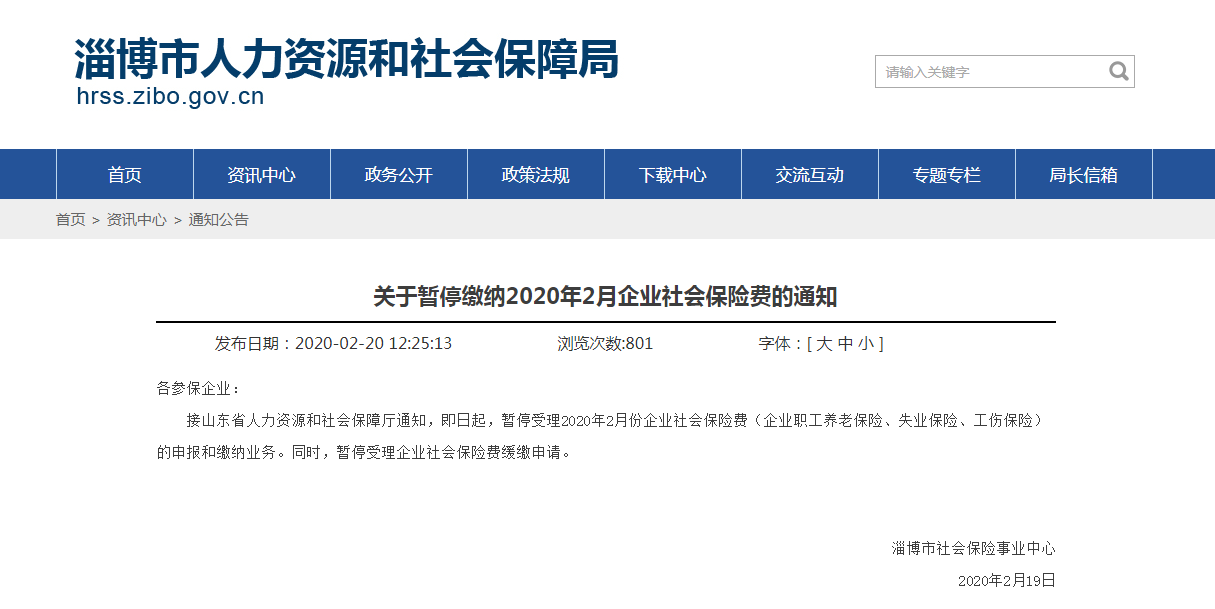 淄博市人力資源和社會(huì)保障局網(wǎng)站發(fā)布《關(guān)于暫停繳納2020年2月企業(yè)社會(huì)保險(xiǎn)費(fèi)的通知》