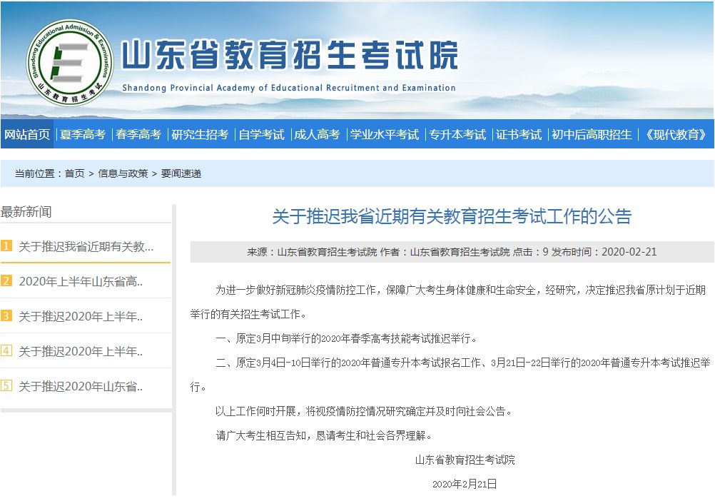 關(guān)于推遲我省近期有關(guān)教育招生考試工作的公告