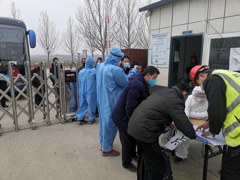 上午10時30分,第一輛張貼“魯中公路新寧高速第二標段農民工返崗專車”標志的大巴車緩緩駛停二分部華豐鎮(zhèn)高莊預制場門前,這是新寧高速第二標段首次包車接返農民工。返崗人員下車后,由工作人員逐一進行體溫檢測、登記,并現(xiàn)場簽訂新冠肺炎疫情防控承諾書和返崗信息卡等,手續(xù)辦理齊全后陸續(xù)進入拌合站工作場所。