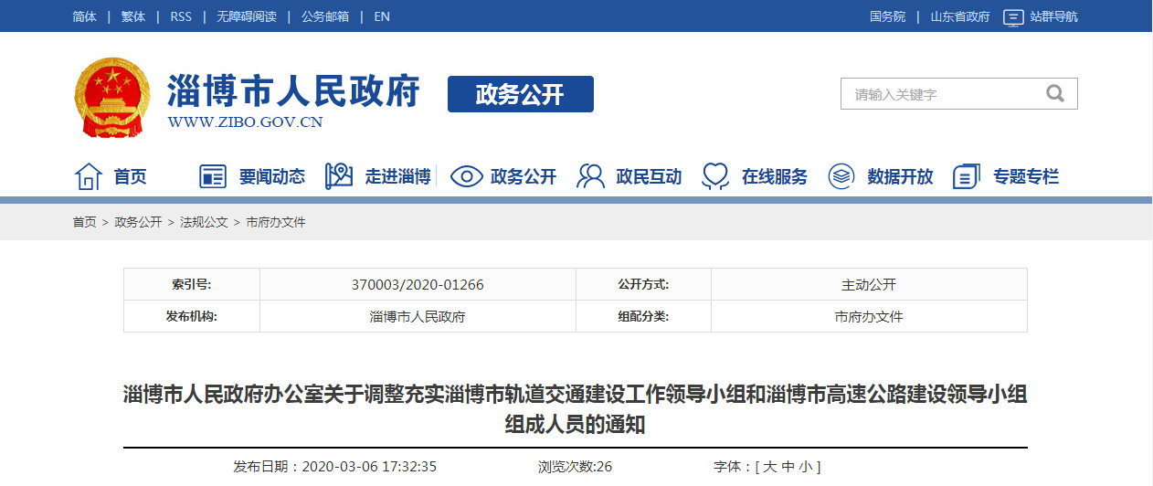 淄博市公布軌道交通和高速公路兩個建設(shè)領(lǐng)導小組成員