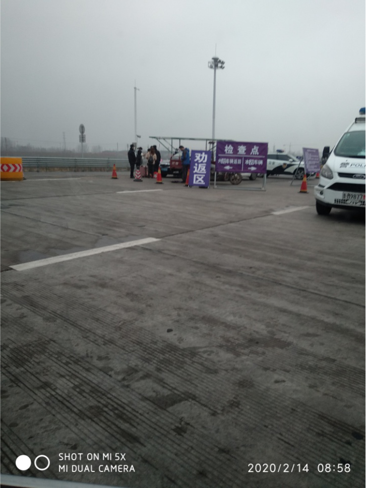 等待了一個小時二十分鐘后,看到業(yè)主拿著政府的批準(zhǔn)文件跟防疫人員交涉。此后代理和業(yè)主帶領(lǐng)我們通過收費(fèi)站,進(jìn)入開標(biāo)項(xiàng)目所在地域。圖片中標(biāo)識牌上寫著外省車輛返回和本省車輛檢查方向指示??磥硗馐≤囕v直接返回,不讓通過。