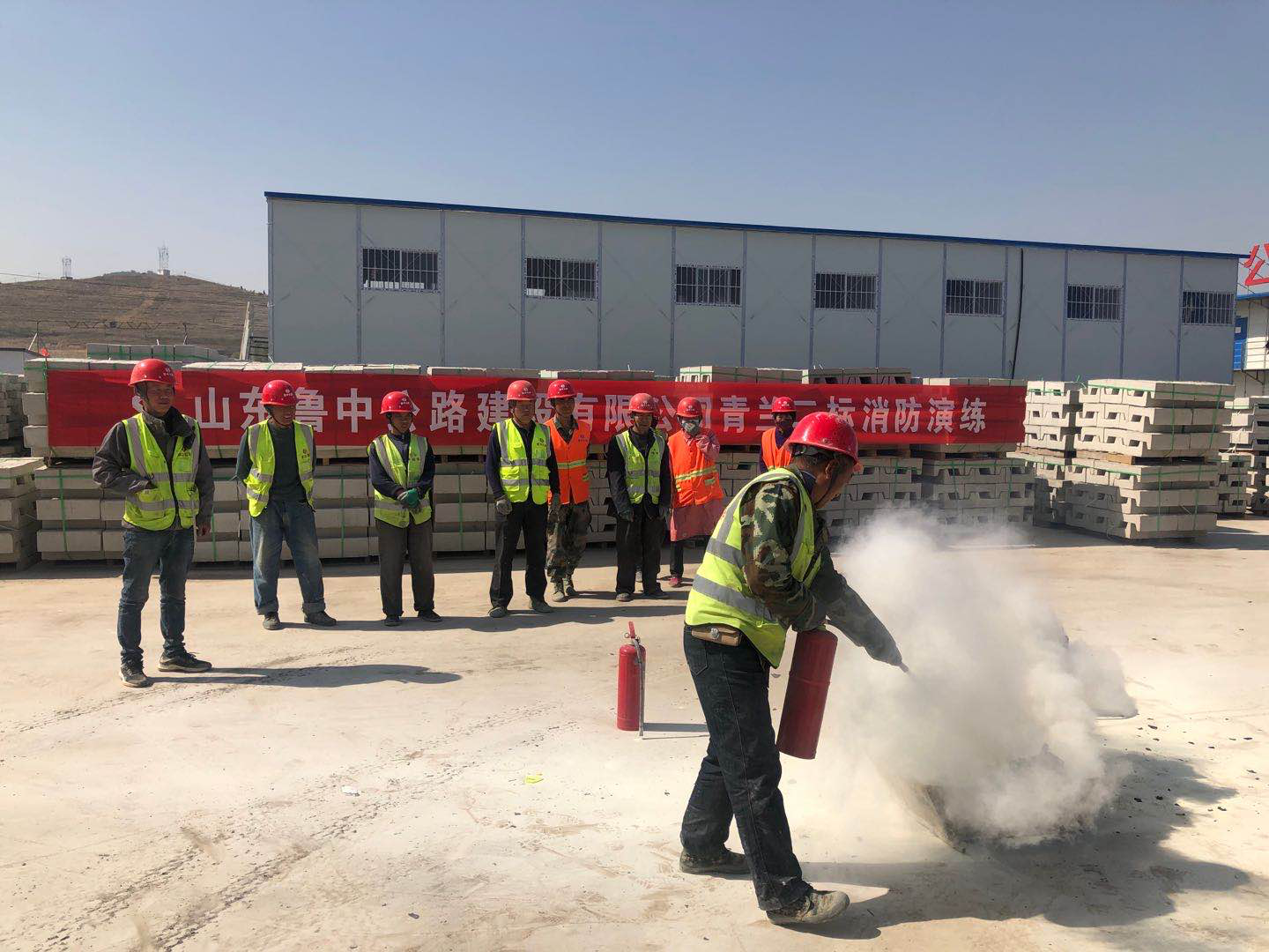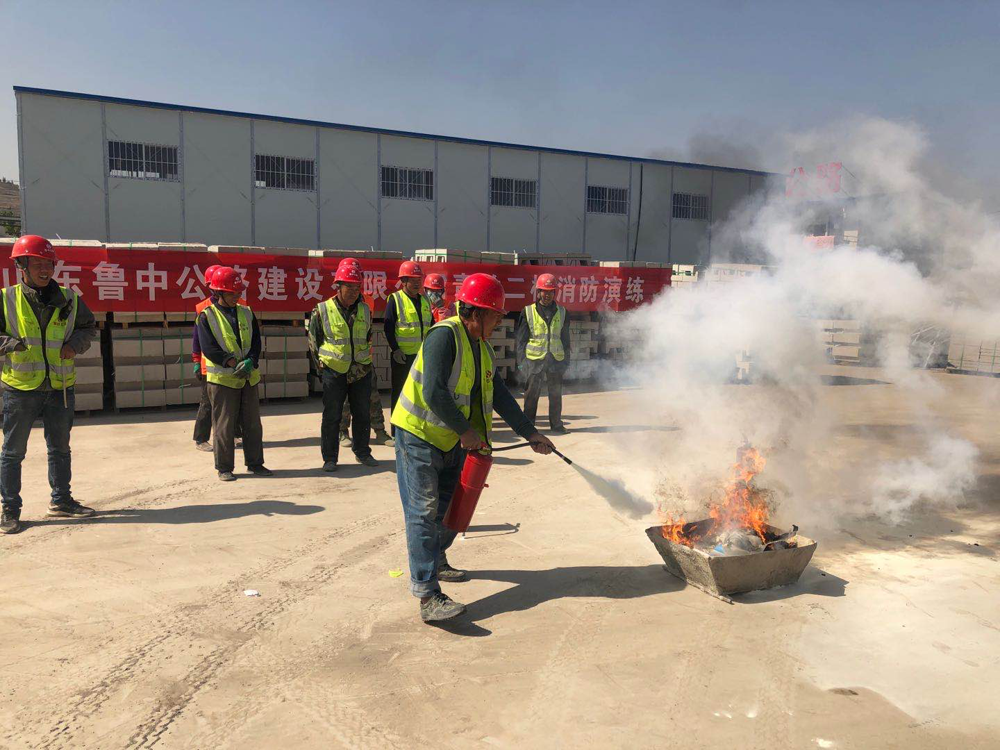 拌合站人員和民工隊(duì)伍依次學(xué)習(xí)如何正確使用干粉滅火器來有效快速消滅火情。