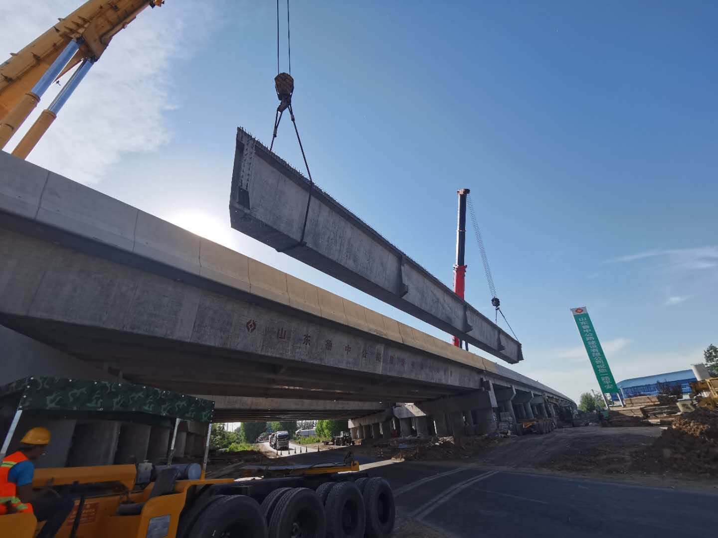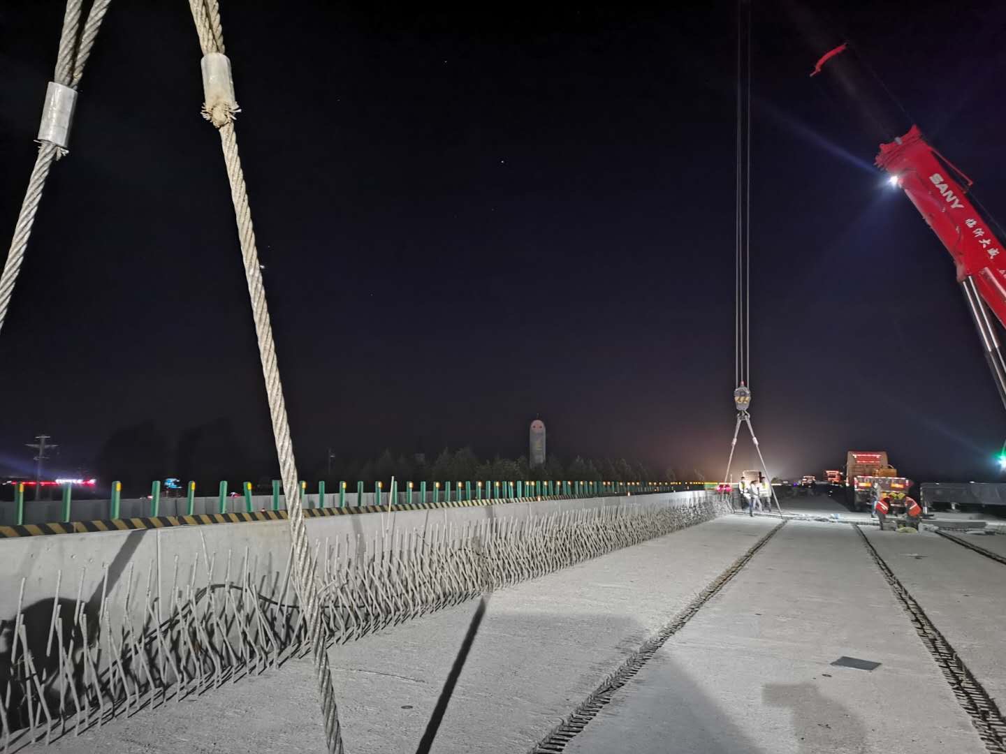 京滬高速公路萊蕪至臨沂段改擴(kuò)建工程第十標(biāo)段,由齊魯交通發(fā)展集團(tuán)投資,山東魯中公路建設(shè)有限公司承建,起訖點(diǎn)樁號(hào)K692+900-K710+000,路線全長17.1km(含紅花埠互通一處、主線收費(fèi)站一處),設(shè)計(jì)速度120km/h,按雙向八車道標(biāo)準(zhǔn)進(jìn)行擴(kuò)建。我部于2020年1月18日率先完成第四階段全幅交通導(dǎo)改,右幅雙向通行,左幅封閉施工,進(jìn)行左幅老橋拆除新建和路面施工。其中K693+964.355歸昌特大橋,全長共1233m,共14聯(lián),是我標(biāo)全線唯一的特大橋,也是全線重點(diǎn)控制工程之一,歸昌特大橋1-3聯(lián)上部結(jié)構(gòu)形式采用現(xiàn)澆普通鋼筋砼空心板、第10、12聯(lián)采用普通鋼筋砼現(xiàn)澆板(拆除新建)、第4-9、13、14聯(lián)采用預(yù)應(yīng)力砼(先張)橋面連續(xù)空心板(20m共435片,22.31m共5片)、第11聯(lián)采用預(yù)應(yīng)力砼(后張)簡支小箱梁(40m共14片),下部結(jié)構(gòu)采用柱式墩+肋板臺(tái)。預(yù)制箱梁所處位為歸昌特大橋第11聯(lián)拆除新建,上跨G310國道,車流量較大,施工吊裝難度風(fēng)險(xiǎn)大,為確保歸昌特大橋左幅最后5片預(yù)制箱梁順利架設(shè),我部首先進(jìn)行優(yōu)化施工方案、細(xì)化工作計(jì)劃、強(qiáng)化施工組織,成立專門的領(lǐng)導(dǎo)小組,合理進(jìn)行資源配置,然后施工前對(duì)現(xiàn)場施工人員進(jìn)行安全、質(zhì)量技術(shù)交底,讓現(xiàn)場每位施工人員能夠熟悉架梁流程及施工安全注意事項(xiàng),提高安全生產(chǎn)意識(shí),嚴(yán)格按照技術(shù)規(guī)范及要求精細(xì)架設(shè)。5月10日我部開始進(jìn)行箱梁吊裝前一系列準(zhǔn)備工作,本次吊裝采用2輛400t汽車吊雙機(jī)起吊的形式進(jìn)行施工,在箱梁運(yùn)輸和架設(shè)過程中,項(xiàng)目部領(lǐng)導(dǎo)親自在現(xiàn)場指揮,我部克服了天氣及運(yùn)梁線路條件復(fù)雜、上跨G310國道等不利因素,在全體人員的共同努力下,于5月11日晚20:10分將左幅最后5片預(yù)制箱梁全部順利吊裝到位,實(shí)現(xiàn)主線全線貫通。