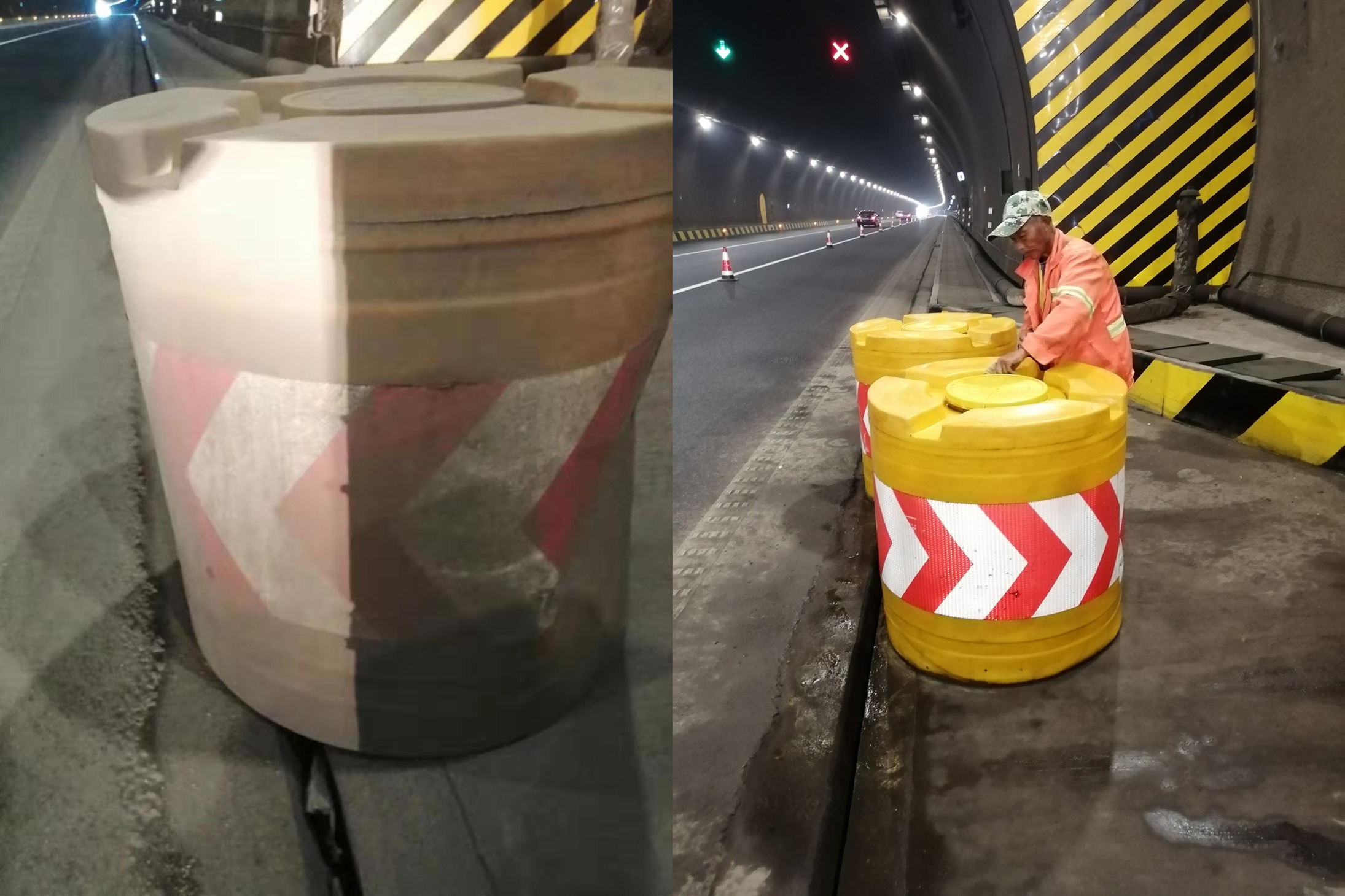 整理、擦拭、清理隧道口的防撞桶及散落的石子碎料