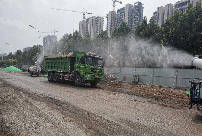 土方開挖采用濕法作業(yè),使用4臺12立方米水車,6臺三輪水車進(jìn)行路面降塵工作
