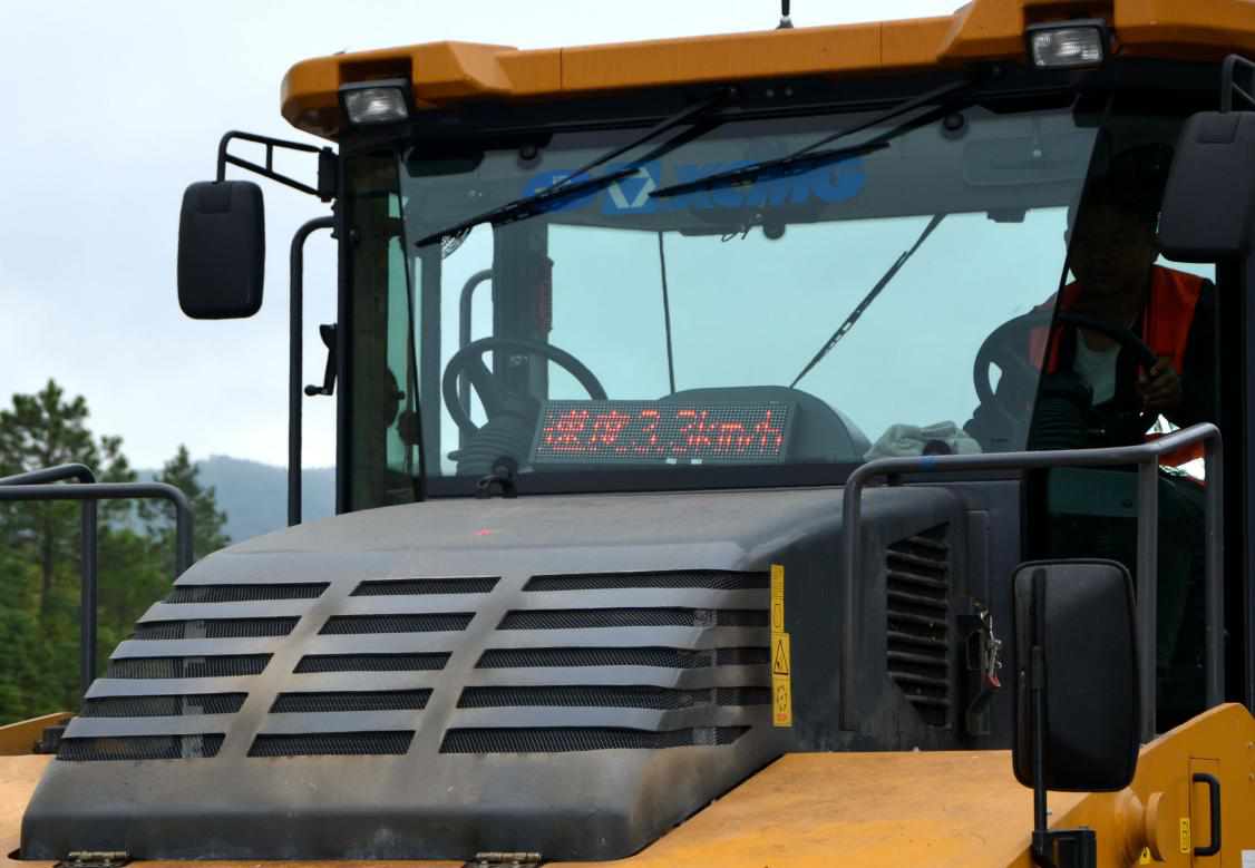 監(jiān)控系統(tǒng)工作原理是壓路機行駛速度由GPS裝置進行監(jiān)測,碾壓溫度由壓路機下的溫度測量裝置監(jiān)測,同時連接機頂的LED屏幕,將監(jiān)測數據在屏幕上即時、直觀的顯示出來,攤鋪機在腳踏板下方安裝溫度監(jiān)控設備,實時將溫度信息公布至攤鋪機上方的LED顯示屏。此監(jiān)控系統(tǒng)有助于現場施工管理人員直觀的監(jiān)控碾壓速度和碾壓溫度,對不符合指標情況及時處理,為路面施工質量和安全生產提供了有利條件。監(jiān)控系統(tǒng)數據的直觀顯示,提高了管理人員和機械操作手的標準化施工意識,嚴格控制攤鋪速度和碾壓溫度,在路面施工搶抓進度的同時,也對施工質量做到精細管理。