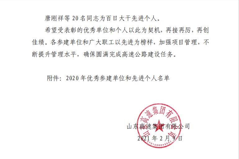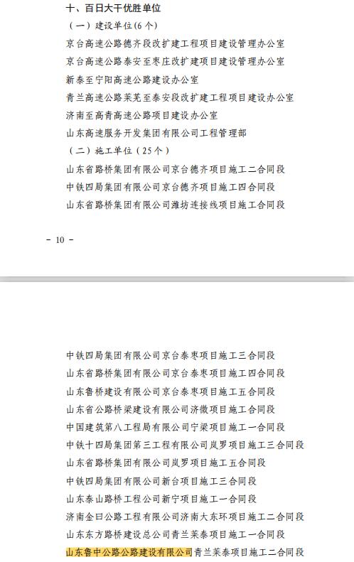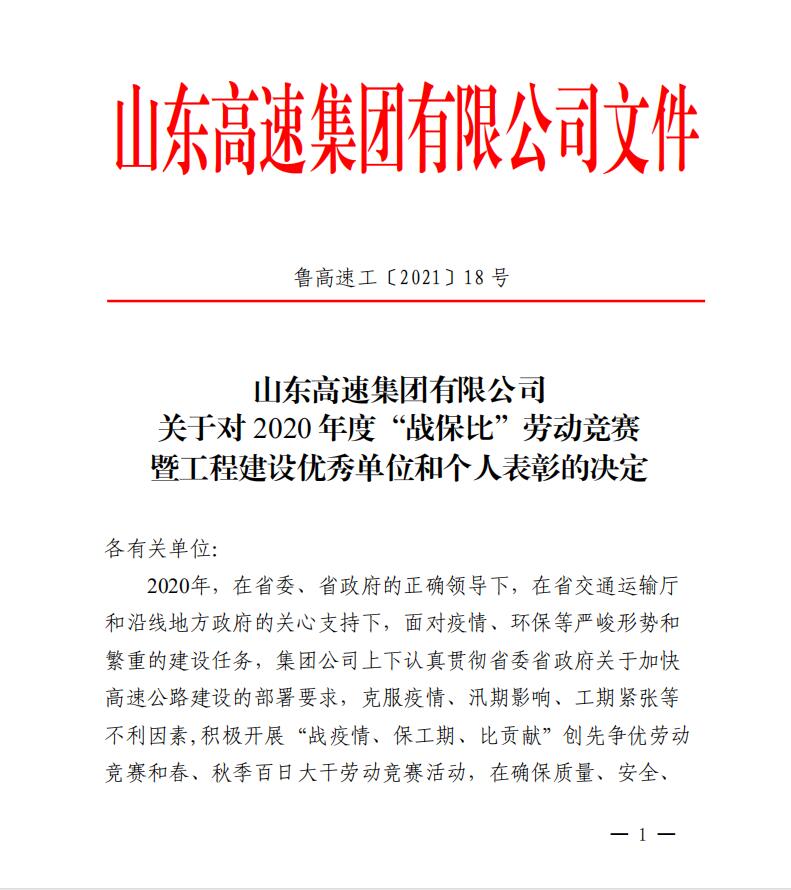 近日,由山東高速集團(tuán)有限公司舉辦的2020年度“戰(zhàn)保比”勞動(dòng)競(jìng)賽結(jié)果揭曉,我公司喜獲“項(xiàng)目通車(chē)突出貢獻(xiàn)單位”、“百日大干優(yōu)勝單位”榮譽(yù)稱號(hào)。