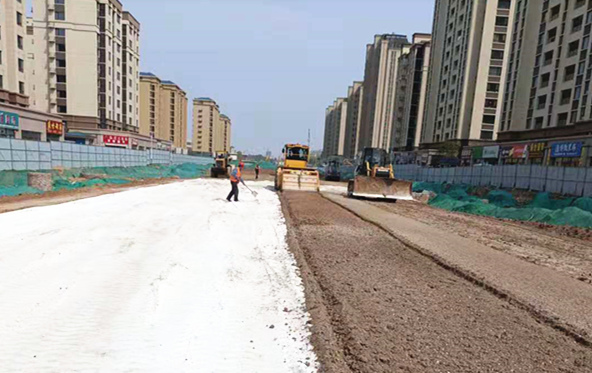 考工路水泥穩(wěn)定碎石基層施工現(xiàn)場(chǎng)