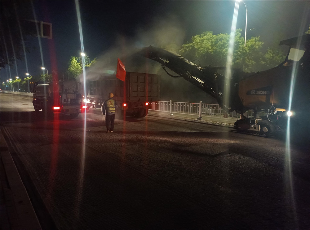 6月17日,開工一個月,項目部累計完成銑刨103154.0 m,完成總量的39.4%;完成攤鋪42686m,分別完成總量的28.2%。完成混凝土路面挖除8247米,完成總量的82.1%。