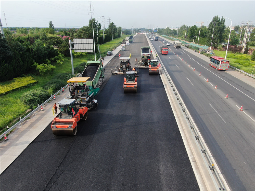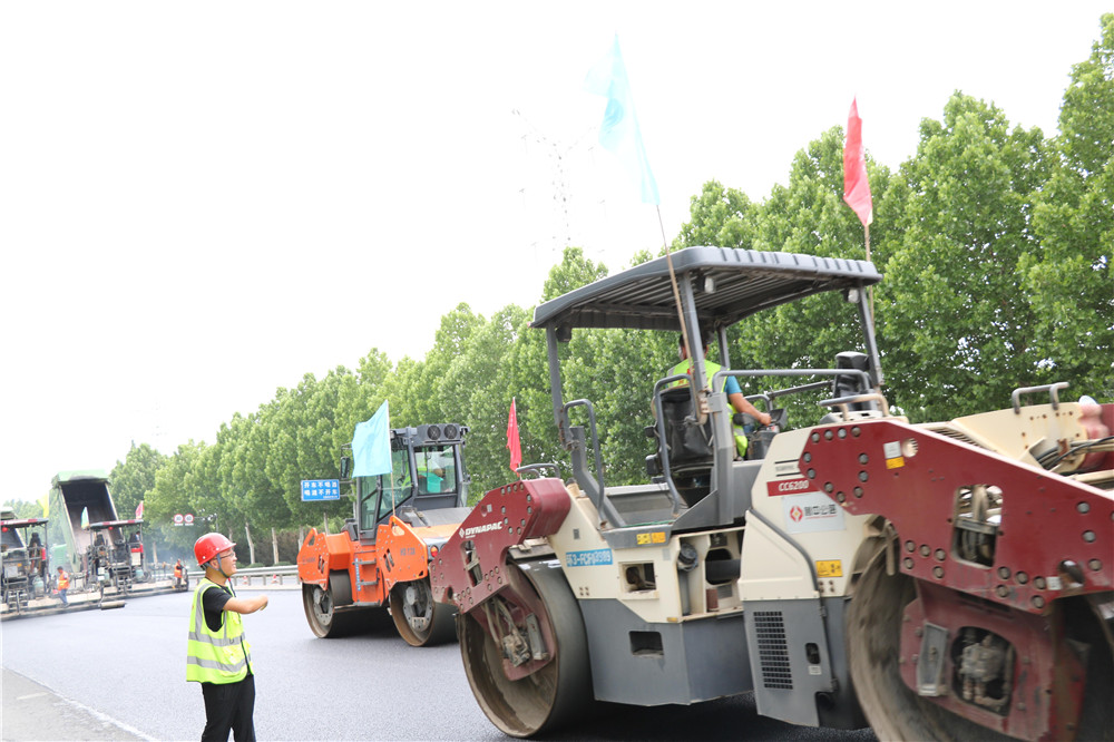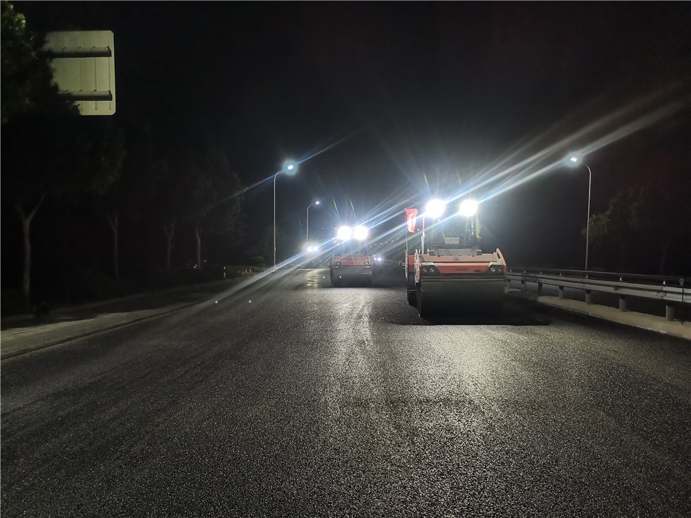 7月19日,博山城區(qū)段克服夜間施工難,主線全幅瀝青面層貫通。