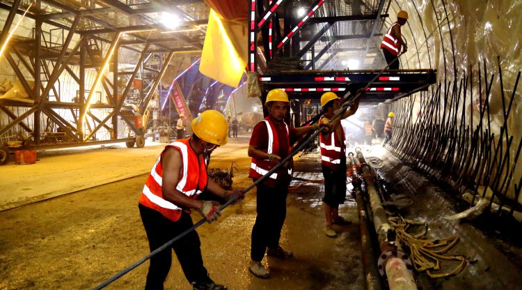 在盤(pán)頂山隧道內(nèi),工人們正在搬運(yùn)鋼筋。