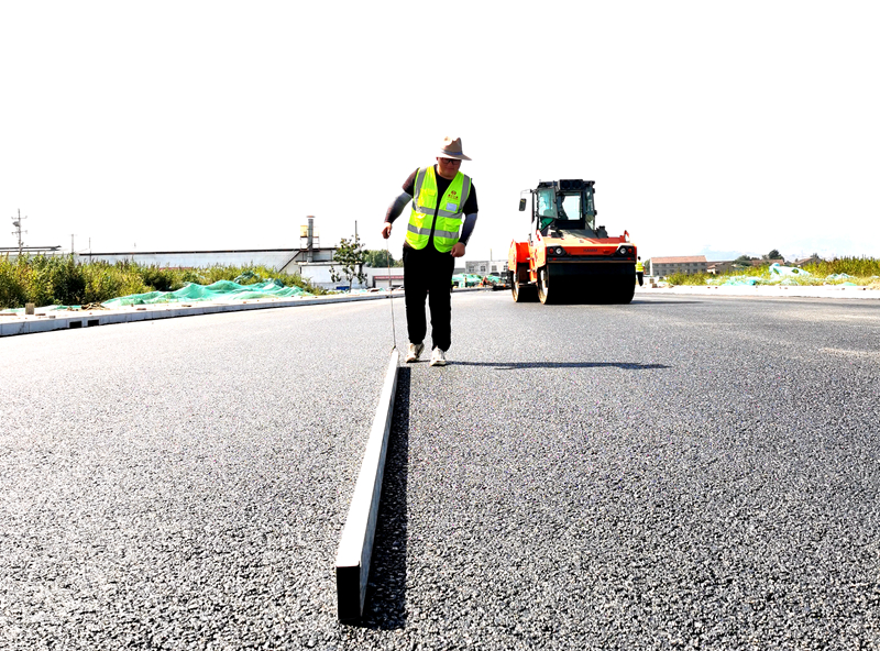 施工人員嚴格控制瀝青攤鋪要點,下面層攤鋪速度宜控制在2.0m/min左右,松鋪系數(shù)應(yīng)與夯錘振搗等級、攤鋪速度、碾壓工藝等相匹配,各項施工參數(shù)嚴格按照規(guī)范施工,現(xiàn)場做好虛鋪厚度的檢測與記錄。經(jīng)過上周的路基清理工作在十月一日沿河路已經(jīng)完成k0+200-k1+040、k1+423-k1+687、k1+735.6-k1+926下面層AC-20瀝青全幅攤鋪作業(yè)施工。