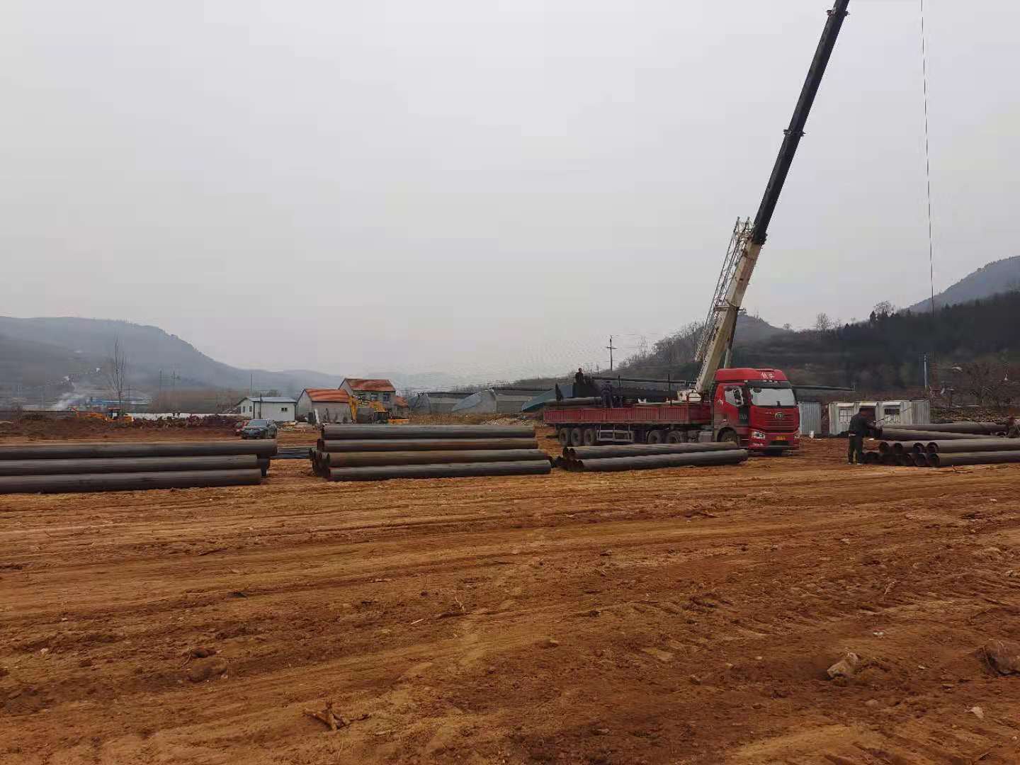 11月20日,鋼筋廠大棚立柱進場。
