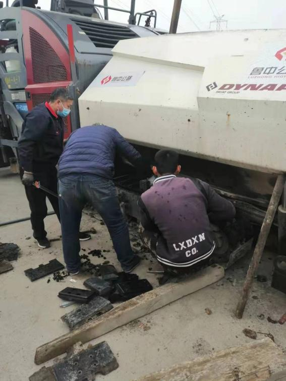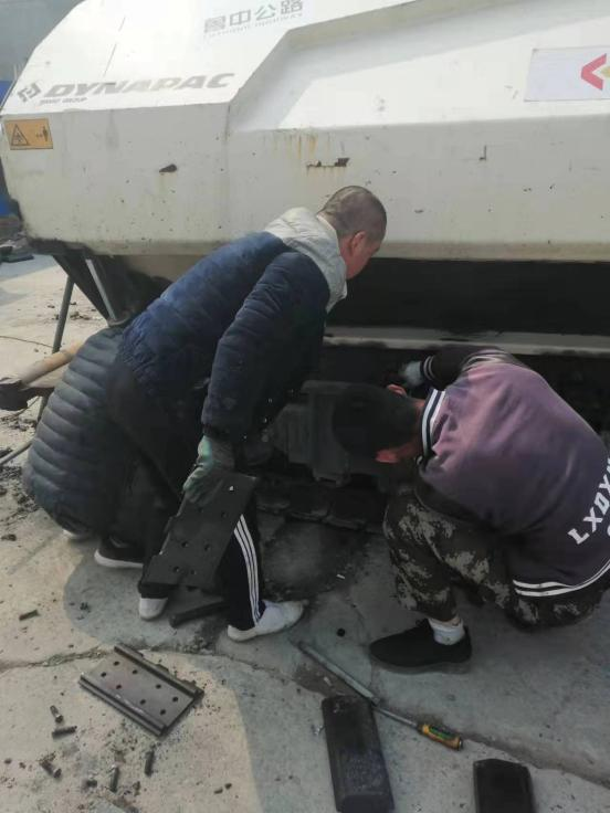 為攤鋪機(jī)更換履帶橡膠板,拆下來的螺絲能用的全部用上,杜絕浪費(fèi),節(jié)約費(fèi)用。
