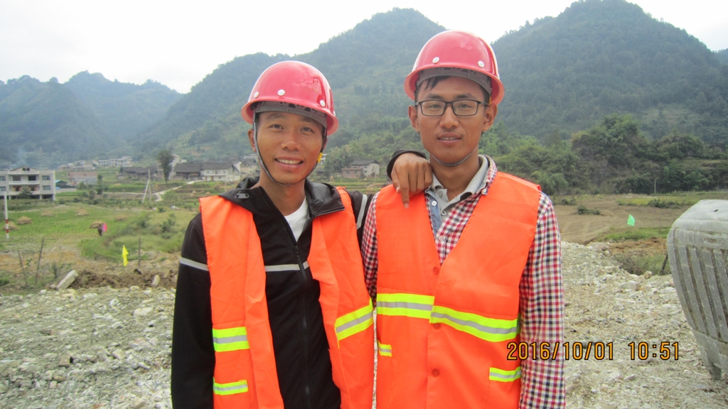 10月1日上午10:50,貴州項(xiàng)目部技術(shù)負(fù)責(zé)人劉永吉、施工員吳琦在路基填方施工現(xiàn)場(chǎng)合影。