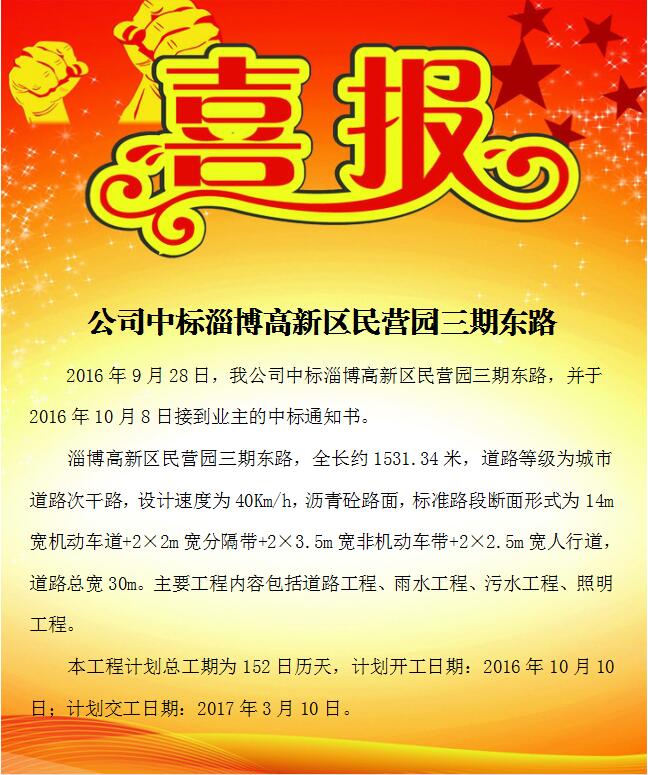 公司中標(biāo)淄博高新區(qū)民營(yíng)園三期東路