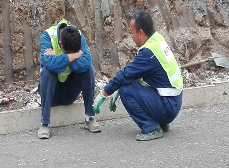 二零一六年十月二十日,上午九時(shí)左右,雅迪路原本就因?yàn)檐噥碥囃嚵髁看蠖中[,再加上水穩(wěn)攤鋪?zhàn)鳂I(yè),運(yùn)輸車和機(jī)械運(yùn)轉(zhuǎn)就顯得更是喧囂異常了。但是看著因大干期間,數(shù)日來晝夜趕工的工友們在等待下道工序推進(jìn)前仰伏在崗位上時(shí),突然想起前蘇聯(lián)的衛(wèi)國戰(zhàn)爭片《這里的黎明靜悄悄》,真有異曲同工之妙。