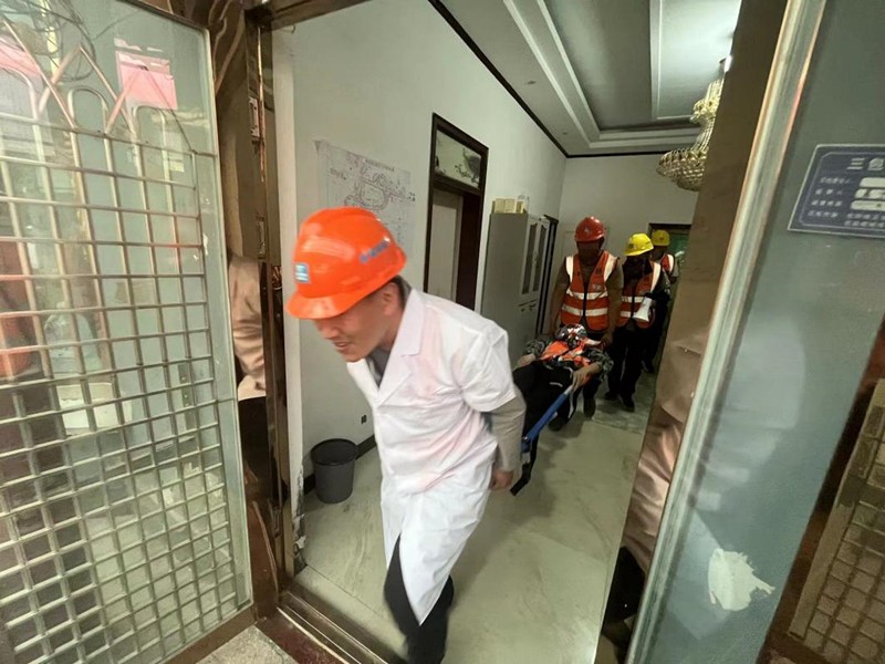 醫(yī)療救護(hù)組將傷者抬出火災(zāi)現(xiàn)場并對傷者進(jìn)行緊急救治送醫(yī)